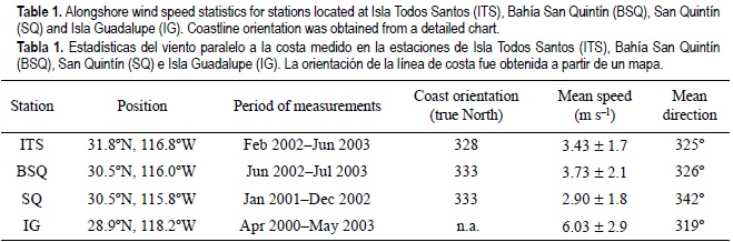 Winds were measured using Aanderaa meteorological stations at four selected locations along the northern Baja California coast, from January 2000 to July 2003. These include two coastal stations, one at Isla Todos Santos (ITS) and another at Bahía San Quintín (BSQ); one inland station at San Quintín (SQ); and an oceanic station at Isla Guadalupe (IG) (see table 1 and fig. 1). The ITS station is located in the northern part of the island, about 15 km west of Ensenada. The BSQ station is located near the shoreline north of San Quintín Bay, while the SQ station is about 20 km inland. The IG station is located in the southern part of the island. The time frame of measurements differs among the four stations but the basic statistics of all data at each station are included here in order to provide a reference for future works.