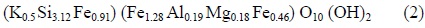 Estos datos fueron introducidos en el programa Fullprof como valores de partida para el refinamiento de los factores de ocupación atómica en la estructura. El cálculo se hizo mediante análisis Rietveld siguiendo el procedimiento descrito previamente por Fernández-Bastero et al. (2000, 2003) y se extendió a las 26 muestras de sedimento empleadas en el estudio. Como resultado se obtuvo la siguiente fórmula media para los minerales glauconíticos de la plataforma continental gallega: