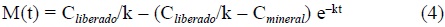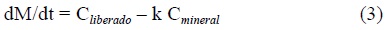 en donde M(t) es la velocidad de liberación de cada ión M (mol m-2 h-1) y k representa el tiempo de respuesta para alcanzar el valor estacionario (Cliberado/k), es decir, el tiempo necesario para que la cinética de disolución sea exclusivamente controlada por la reacción química de disolución, descartándose a partir de ese momento efectos cinéticos ajenos al proceso de disolución. Puesto que en nuestro caso es k ~ 2 días (fig. 1), se empleó el promedio de los últimos puntos de la gráfica (t > 15días) como representativo del valor estacionario de la velocidad de liberación, para cada ión, en los experimentos a pH constante.