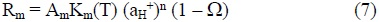 en donde RM = velocidad específica para cada ión (M) normalizada a la estequiometría de la fórmula, y KH,M KO,M y KOH, M son las constantes cinéticas en condiciones ácidas, neutras y alcalinas, respectivamente.