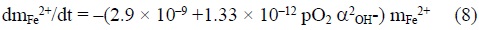 donde mFe2+ = molaridad del Fe2+ en solución, aOH = actividad del ión hydroxilo, y pO2 = presión parcial de oxígeno, en atmósferas.