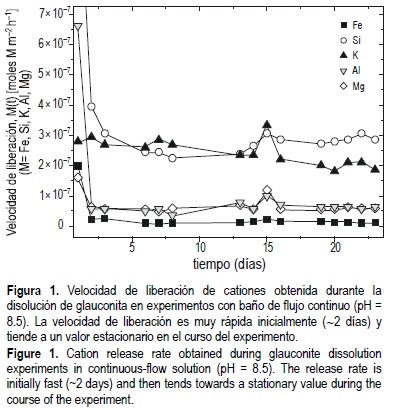 La pauta de liberación de cationes en el tiempo durante el proceso de disolución se obtuvo mediante los experimentos en baño de flujo continuo y se muestra en la figura 1 para Fe, Si, K, Al y Mg a pH = 8.5. Como se observa, la liberación de cationes es bastante rápida al inicio del proceso de disolución y decrece de forma exponencial hasta alcanzar, al final del experimento, un valor estacionario independiente del tiempo. Dicho comportamiento es consistente con un mecanismo de difusión, siendo la variación de la velocidad de liberación de cationes (dM/dt) proporcional al contenido en la fase sólida, según