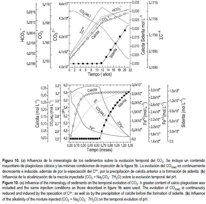 La evolución del CO2 disuelto (fig. 10a), sigue en este caso una curva continuamente decreciente, con dos cambios de pendiente, asociados respectivamente a la precipitación de calcita y siderita. La precipitación inicial de la calcita, más soluble que la siderita, ocurre por razones cinéticas y depende de la velocidad relativa de liberación de Ca2+ y Fe2+ por la anortita y la glauconita, respectivamente. En las condiciones del modelo, la disolución de anortita produce un alto contenido inicial de Ca2+ y la especiación del CO2 induce un incremento continuo en CO32- y HCO3- dando lugar a la precipitación inicial de calcita. Durante ese periodo inicial el FeCO3 permanece como especie disuelta subsaturada que contribuye al incremento del total de especies carbonatadas ∑C4+ hasta el momento de la precipitación de siderita, en el cual se produce el cambio de pendiente. Es interesante notar que en esta etapa la formación de magnesita es inhibida también por razones cinéticas, mediante la precipitación simultánea de calcita y siderita, como carbonatos más insolubles.