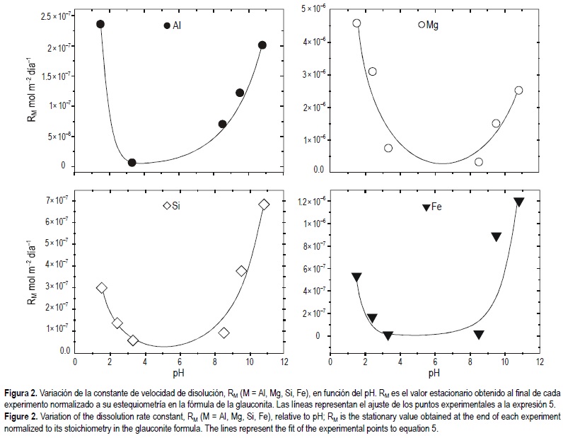 En segundo lugar se obtuvieron las velocidades de disolución (RM) para cada ión (M), y cada valor del pH mediante normalización de los valores estacionarios M(t) a la estequiometría de la fórmula. La variabilidad de RM respecto al pH se describe en la figura 2 para Al, Mg, Si y Fe. Como se observa, la velocidad de disolución muestra una acusada dependencia del pH, existiendo en todos los casos, un mínimo en valores cercanos al pH neutro. Este hecho es indicativo de un comportamiento dual ácido-base para la disolución, análogo al descrito para otros silicatos (Blum y Stillings, 1995), de tal forma que el proceso de disolución es controlado alternativamente por la adsorción de protones a pH ácido y por la desorción de protones a pH básico, pudiendo ser expresado como