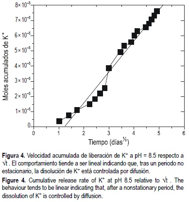 La variación de la velocidad de liberación en el tiempo (fig. 3a) presenta ligeras inestabilidades en la primera mitad del proceso de disolución (300 h) tendiendo a una pauta constante al final del proceso. En el caso del pH (fig. 3b), estas variaciones son mucho más acusadas para el rango de pH ácido hasta un valor cercano a pH = 4. A partir de ese momento, las velocidades de disolución tienden, también en este caso, a un valor constante aproximándose al comportamiento congruente. Las diferencias de velocidad observadas entre los distintos iones en la región de comportamiento incongruente podrían ser atribuidas al comportamiento del K+ que es el elemento que se libera más rápidamente. Así, en la figura 4 se ha representado la velocidad acumulada de liberación de K+ en función de t1/2. En este tipo de representación, un comportamiento lineal indica que el mecanismo de disolución ocurre por difusión, lo que corresponde a la tendencia observada en la gráfica para el K+ al final del proceso. Este hecho sugiere que el comportamiento incongruente es inducido por las inestabilidades en la disolución del K+ hasta alcanzar un comportamiento difusivo. Su influencia sobre los otros elementos se justifica, además, por dos razones: primero, porque la velocidad de liberación es la más alta, y segundo, porque su posición en la estructura de la glauconita, como catión interlaminar, determina la posibilidad de hidratación de los otros iones, tetraédricos y octaédricos.