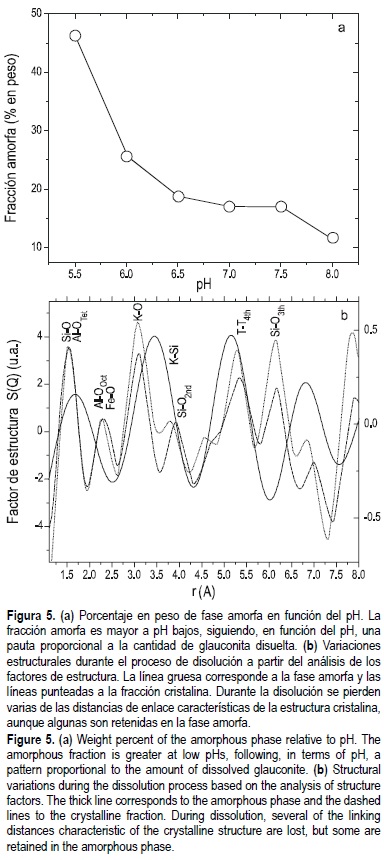 Las variaciones estructurales así como la posible presencia de fases secundarias derivadas del proceso de disolución fueron caracterizadas a partir del análisis de los diagramas de difracción por rayos X (DRX). El resultado de este análisis indica que el edificio estructural es retenido parcialmente durante todo el proceso de disolución. Tampoco existe una dilatación de la estructura asociada a los valores de las reflexiones (001) características del grado de expansibilidad, ni se observa la aparición de reflexiones correspondientes a la presencia de fases minerales secundarias. El principal efecto de la disolución parece estar asociado al aumento gradual de la fase amorfa (Santos et al., 2004). El porcentaje de esta componente, cuantificado mediante el método de Rietveld y representado en la figura 5a donde se muestra como el grado de fase amorfa en función del pH, sigue una pauta análoga a la velocidad de disolución, siendo mayor para valores ácidos del pH donde la masa disuelta también es mayor. Desde el punto de vista microestructural, la disolución implica cierto desorden que se manifiesta en ligeras variaciones en la distribución de capas octaédricas y tetraédricas. Este hecho se aprecia en la figura 5b, en la que se han representado las funciones de distribución radial determinadas a partir de los diagramas de difracción tanto para la fase amorfa (línea gruesa) como para el residuo cristalino antes y después del ataque ácido (líneas punteadas). Como se puede observar, parte de las distancias interatómicas características en la fase cristalina, en particular las distancias octaédricas (AL-Ooct, Fe-Ooct) y las distancias interlaminares (K-O) se pierden en la fase amorfa. Sin embargo, otras distancias como las correspondientes a tetraedros de Si-Otet, Al-Otet siguen siendo detectables en la componente amorfa.