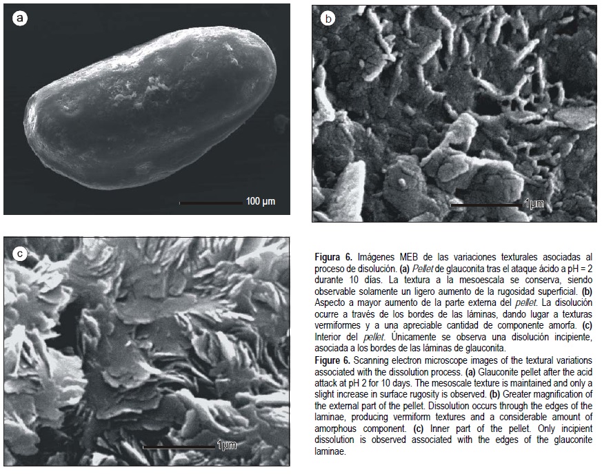 Las modificaciones texturales inducidas por el proceso de disolución en condiciones ácidas fueron seguidas mediante microscopio electrónico de barrido (MEB). En la figura 6a se muestra el aspecto característico de un pellet de glauconita después de tratamiento a pH = 2 durante 20 días. Se puede observar, como la textura a la escala mesoscópica es retenida después del ataque ácido, siendo únicamente apreciable un ligero aumento de la rugosidad superficial. A mayor magnificación, en la parte superficial (fig. 6b), las hojas de glauconita presentan bordes redondeados, dando lugar a un aspecto vermiforme, indicando claramente que el proceso de disolución procede a través de los bordes de las láminas. Es también apreciable la presencia de una parte importante de componente amorfa que recubre parcialmente el espacio entre láminas. El análisis de la variación composicional mediante EDX muestra en esta zona una importante disminución de K, Fe, Al, y Mg y en menor medida de Si. En la parte interna, por el contrario (fig. 6c), la textura en hojas o rosetas propia de la glauconita, se encuentra prácticamente inalterada, observándose que el grado de disolución es mucho menor. Este hecho sugiere que el proceso de disolución es retardado en su propagación hacia el interior mediante la formación de una lámina de fase amorfa superficial que actúa diminuyendo la superficie reactiva.