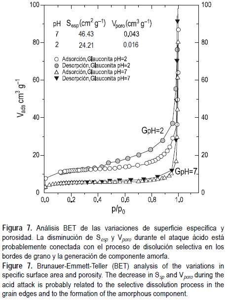 Para estimar este parámetro, la variación en la superficie específica fue determinada mediante el método BET. Las isotermas para la adsorción-desorción de nitrógeno, realizadas previamente y después del tratamiento ácido, se muestran en la figura 7. Los valores de superficie específica y volumen de poro se relacionan en el inserto. Las curvas obtenidas corresponden al tipo II (Brunauer et al., 1938). La superficie específica disminuye desde un valor de 46.43 m2 g-1 para la glauconita no tratada hasta 24.21 m2 g-1 después del proceso de disolución, decreciendo también el volumen de poro.