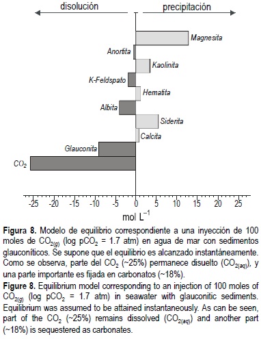 Como se observa en la figura 8, la parte de CO2 que permanece disuelto (CO2(aq)), en equilibrio con la solución, es del orden del 25%. Las fases que se disuelven junto a la glauconita son silicatos: anortita, feldespato potásico y albita, induciendo la formación de caolinita, como silicato autigénico, de óxidos (goetita y hematita) y carbonatos (magnesita, siderita y calcita). El total de CO2 capturado en carbonatos es del orden del 18%, principalmente en forma de magnesita y siderita. Esta situación representa el límite máximo de captura de CO2 para las condiciones termodinámicas del modelo y corresponde obviamente a una situación ideal ya que el equilibrio final, y sobretodo la pauta de evolución en el tiempo de las fases precipitadas depende de la evolución temporal del CO2.