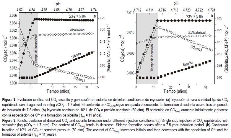 El modo en que la forma de inyección afecta a la evolución del CO2 se muestra en la figura 9b, donde se ha simulado un proceso de inyección continua de un volumen de 1000 L de CO2, que varía en el tiempo para mantener una presión constante (log pCO2= 1.7 atm). En este caso, el contenido en CO1(aq) aumenta de forma continua, hasta el inicio de la reacción de carbonatación y la precipitación de siderita. El descenso del pH es ligeramente menor que en la situación anterior debido al balance que se establece entre el CO2 consumido vía especiación y el que es aportado continuamente al sistema. La creación de alcalinidad es en este caso más lenta y también se retrasa el momento en el que se alcanza el valor crítico de alcalinidad (~ 0.18 mol L-1) necesario para la formación de siderita (tind ~ 11 años).