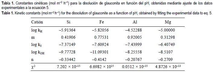 La glauconita forma una solución sólida de composición variable entre los términos glauconita-celadonita. Para referir los valores experimentales (elementos liberados en mg L-1) a la estequiometría de la fórmula y así obtener la velocidad de disolución en términos absolutos (mol m-2 h-1) ha sido necesario determinar previamente el valor promedio de la fórmula, en las muestras empleadas en el estudio. Con este fin, en primer lugar se analizaron varios granos seleccionados de glauconita mediante ICP-AES, obteniéndose 18.9 ± 0.4% de Fe, 22.6 ± 0.5% de Si, 6.12 ± 0.14% de K, 1.50 ± 0.04% de Al y 2.52 ± 0.5% de Mg, en peso.