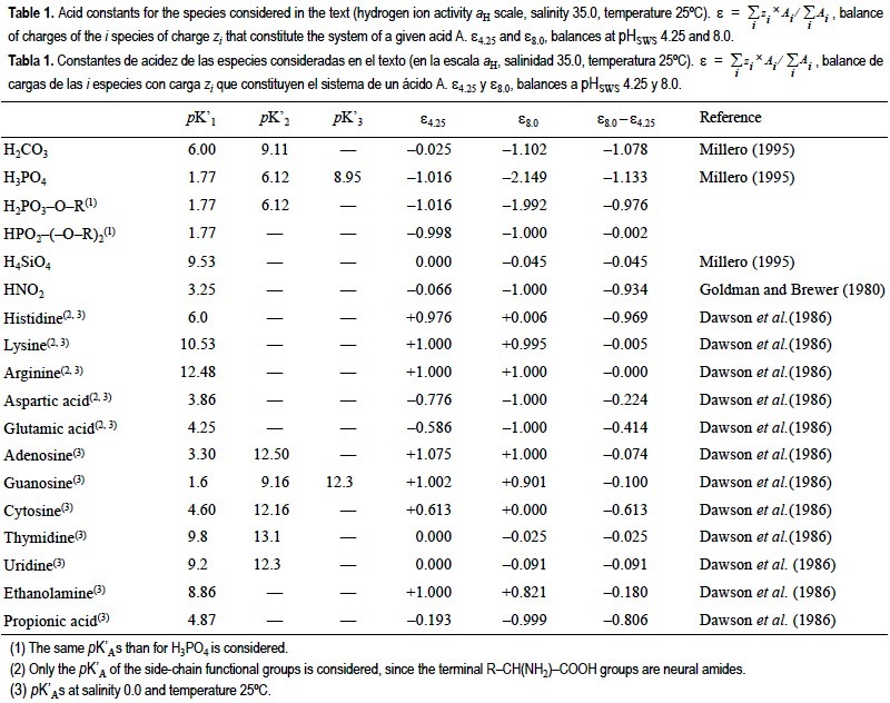 Although Eq. (5) can be used for common mass balance purposes, it is not suitable to study the TA change of seawater during the photosynthesis of marine phytoplankton (ΔTA). The accurate quantification of ΔTA requires consideration of the contribution of the other CT and PT species able to accept a hydrogen ion during the TA determination. In this case, ΔTA could be more easily calculated considering the complementary balance of strong cations minus strong anions. In the context of the operational definition of TA, a strong cation is any cation that is not able to donate a hydrogen ion at the equivalence point of the carbonic acid system species (e.g., Na+ and NH4+). Accordingly, a strong anion is any anion that is not able to accept a hydrogen ion in the same conditions (e.g., Cl- and NO3-). Based on this definition, Brewer et al. (1975) established that TA increases (decreases) 1 eq per mol of NO3- and PT consumed (produced) during the synthesis (early degradation) of the organic tissues of marine phy-toplankton, i.e. ΔTA/(ΔPT + NO3-) = -1, and defined the conservative chemical parameter "potential alkalinity" (TAP) as the sum of TA + [NO3-] + [PT]. Note that considering the pK'As of the phosphoric acid system, PT is not able to accept 1.016 eq of H+ per mol of P at pHSWS 4.25 (see the balance of charges ε4.25 in table 1). Culture experiments conducted by Brewer and Goldman (1976) and revisited by Goldman and Brewer (1980) confirmed the experimental validity of TAP. On the basis of those experiments, Broecker and Peng (1982) presented the following simplified version of Brewer et al.'s (1975) equation: ΔTA/ΔNO3- = -1, which frequently appears in the literature. In any case, these relationships between TA and NO3- or TA, NO3- and PT assume that the organic constituents of marine phytoplankton are neutral; that is, they do not play any part in the hydrogen ion balance of seawater. But, how accurate is this assumption?
