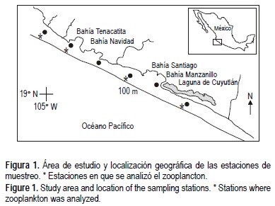 El área de estudio comprende la franja de la plataforma continental desde Punta Farallón, en el estado de Jalisco (19°19'77" N, 105°00'28" W), hasta Cuyutlán, Colima (18°58'24" N, 104°13'51" W) (fig. 1). Allí se presentan ties condiciones ambientales durante el año, las cuales están influenciadas por la Corriente de California (CC), la Corriente del Golfo de California (CGC), la Corriente Norecuatorial (CN) y la Contracorriente Norecuatorial (CCN) (e.g., Wyrtki 1965, Pacheco-Sandoval 1991, Filonov et al. 2000). Durante el invierno, cuando los vientos dominantes provienen del norte, la zona es influenciada por las CC y CGC, lo que resulta en bajas temperaturas y altas concentraciones de nutrientes. En primavera, cesa la influencia de las corrientes del norte, la termoclina se hunde y la temperatura superficial del mar se incrementa. En el verano, los vientos provienen del sur y la zona es dominada por las bifurcaciones de la CN y la CCN, caracterizadas por aguas cálidas y oligotróficas (Wyrtki 1965, Filonov et al. 2000).