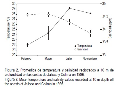 Los valores de temperatura y salinidad registrados a 10 m de profundidad tienden a mostrar homogeneidad espacial en cada muestreo y cambios significativos entre los meses analizados (P < 0.001) (fig. 2). En febrero se observan los menores valores de temperatura (22°C) y los mayores de salinidad (34.6 ppm) del ciclo anual. En mayo se observa un fuerte incremento de la temperatura (24.3°C), conservándose los valores altos de salinidad. En julio y noviembre se registran las mayores temperaturas (28-29°C) y las menores salinidades del ciclo anual (34.3-33.8 ppm).