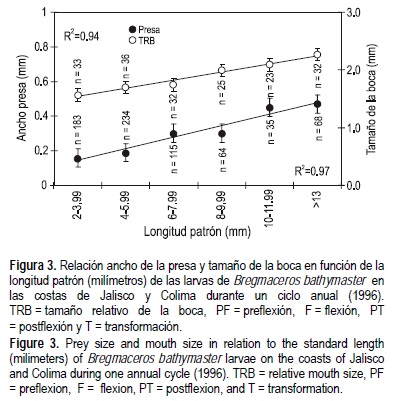 Se obtuvo el ancho de las presas y el tamaño relativo de la boca de las larvas en función de la longitud patrón. El tamaño de la boca se cálculo mediante el índice de Shirota (1970). Las gráficas obtenidas en ambos casos fueron ajustadas mediante una regresión lineal.