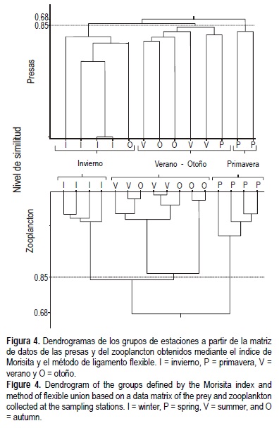 El índice de Morisita definió tres agrupaciones de estaciones de muestreo a un nivel de corte de 0.85, tanto en el caso de las presas de las larvas como en el del zooplancton. Las agrupaciones fueron denominadas como invierno, primavera y verano/otoño (fig. 4).