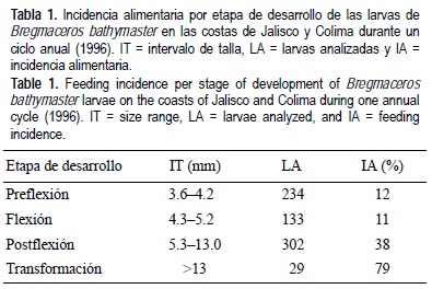 Se analizó el contenido estomacal de un total de 698 larvas de B. bathymaster. La incidencia alimentaria fue <20% en las larvas en estado preflexión y >45% en las larvas en estado de transformación durante las cuatro épocas del año (tabla 1).
