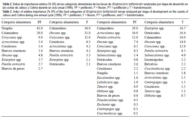 El análisis del contenido estomacal indicó que la dieta se incrementa de 10 categorías alimentarías en las larvas en preflexión a 20 en postflexión (tabla 2). Según el IIR los nauplios de copépodos (42%) y los copépodos calanoideos (20%) fueron las presas más importantes en la dieta de las larvas en preflexión; los copépodos calanoideos (36%) y Oncaea spp. (31%) en las larvas en flexión; los copépodos calanoideos (29%), Acrocalanus spp. (16%) y cladóceros (Penilia avirostris Dana, 1849) (12%) en las larvas en postflexión y los copépodos Euterpina spp. (17%), calanoideos y ostrácodos (16%, cada uno) en las larvas en transformación.