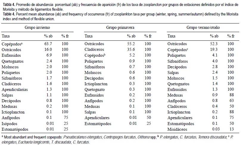En cuanto al zooplancton, la agrupación de invierno se formó por las cuatro estaciones de muestreo de invierno, en las cuales los copépodos (64%) y ostrácodos (16%) fueron los grupos más importantes. Dentro del grupo de los copépodos las especies Pseudocalanus elongatus Boeck, 1865 (27%), Centropages furcatus Dana, 1849 (13%) y Oithona spp. (9%) fueron las más abundantes y frecuentes (tabla 4). La agrupación de primavera incluyó las cuatro estaciones de muestreo de primavera, dominando los ostrácodos (55%) y los cladóceros Penilia avirostris (36%). La agrupación de verano/otoño se formó de las estaciones de muestreo de verano y otoño, donde dominaron los ostrácodos (52%) y copépodos (19%). Dentro del grupo de los copépodos, Pseudocalanus elongatus (31%), Euchaeta longicornis Giesbrecht, 1888 (15%) y Temora discaudata Giesbrecht, 1892 (13%) fueron los más abundantes y frecuentes.