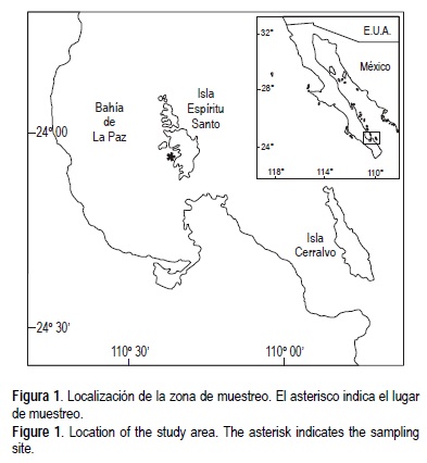 Durante la época reproductiva (junio a noviembre) (Arellano-Martínez 1997) se capturaron 27 hembras de P. zonipectus en la Isla Espíritu Santo, Golfo de California, México (fig. 1). Se hizo necesario mantener un tamaño de muestra relativamente pequeño debido a que la población de P. zonipectus en nuestra área de estudio es pequeña, con una abundancia relativa entre 0.01 y 0.1 (calculada como la proporción entre el número de individuos de P. zonipectus y el número total de peces en la región) (Pérez-España et al. 1996, Aburto-Oropeza y Balart 2001).