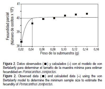 Para calcular el tamaño de la muestra mínima (TMM) necesaria para la estimación de la fecundidad se utilizó el modelo de von Bertalanffy (1938), el cual fue adaptado a los requerimientos del estudio. Se trabajó bajo el supuesto de que a mayor peso se obtiene una mayor fecundidad, hasta que llega un momento en el que la variación del valor de la fecundidad parcial es mínima. El modelo entonces queda como sigue: