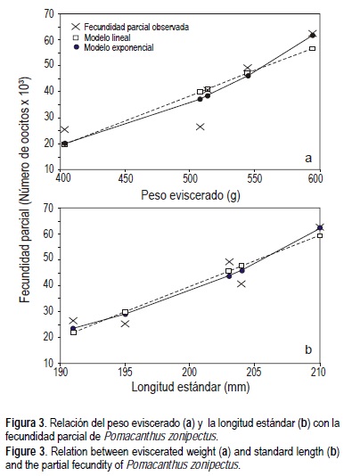 Para establecer la relación entre el peso eviscerado o la longitud del pez y la fecundidad parcial, se hicieron análisis de regresión para ajustar los datos a dos modelos, el lineal (Y = a + bX) y el exponencial (Y = aebX).