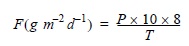 donde P es el peso medio, en gramos, de los cuatro tubos multiplicado por 10, ya que cada tubo representa un décimo de la muestra y multiplicando nuevamente por 8 debido a que la abertura de la trampa es de un 1/8 de m2, y por último dividido entre el número de días (T) que estuvo la botella recolectando material.