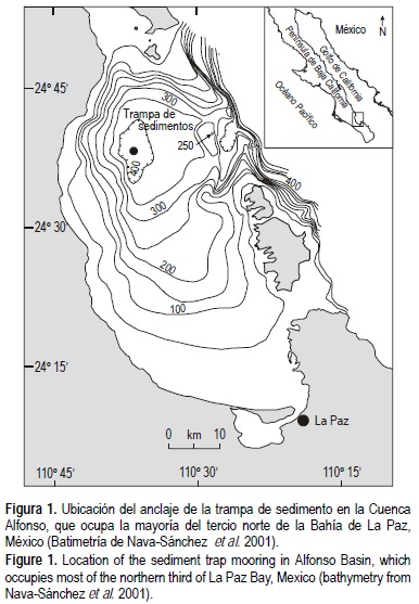 La sedimentación del material particulado es frecuentemente controlada por fenómenos biológicos (nieve marina, agregación por exopolímeros o "TEP", compactación como pelotillas fecales, autoagregación por células del fitoplancton así como el hundimiento de partículas biogénicas individuales (Alldredge y Silver 1988, Silver y Gowing 1991). Además, en las inmediaciones de zonas desérticas como la Península de Baja California, la sedimentación puede estar dominada por partículas biogénicas, ya que no hay ríos permanentes y el drenaje está limitado a los periodos de lluvias fuertes asociadas a tormentas y huracanes (Van Andel 1964, Baba et al. 1991). En el sureste del Golfo de California, fuera de la Bahía de La Paz, la capa mínima de oxígeno (<0.3 mL L-1) se extiende desde cerca de los 200 m hasta 1000 m de profundidad. Dentro de la bahía, en la Cuenca Alfonso, las concentraciones decrecen de 0.3 mL L-1 a 180 m hasta 0.1 mL L-1 a 380 m (Monreal-Gómez et al. 2001). La presencia de esta zona limita la ocurrencia de organismos nadadores, los cuales pueden distorsionar el contenido de material recuperado en las trampas de sedimento, particularmente por la adición de sus cuerpos una vez en contacto con las soluciones preservativas.