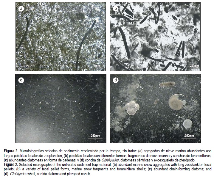 Las observaciones estereoscópicas del material recolectado nos permitieron determinar qué componentes se presentan en cada muestra y su abundancia relativa durante el periodo de recolección. Las partículas predominantes fueron la nieve marina y las pelotillas fecales (fig. 2). Estas últimas varían en forma (algunas de ellas muy alargadas debido a que aún se conservaban intactas antes del fraccionamiento de las muestras) y abundancia entre muestras, indicando que las poblaciones de zooplancton cambiaban en este ambiente. Las diatomeas centrales (v.g. Coscinodiscus) estuvieron presentes todo el año, mientras que las diatomeas formando cadenas fueron evidentemente abundantes sólo en un periodo de dos semanas, durante junio (fig. 2). También se encontraron, entre otros organismos, foraminíferos, pterópodos y gasterópodos. La fracción >1 mm consistió de grandes crustáceos decápodos y ostrácodos, casas de larváceos, pterópodos y comúnmente nieve marina de consistencia gelatinosa.