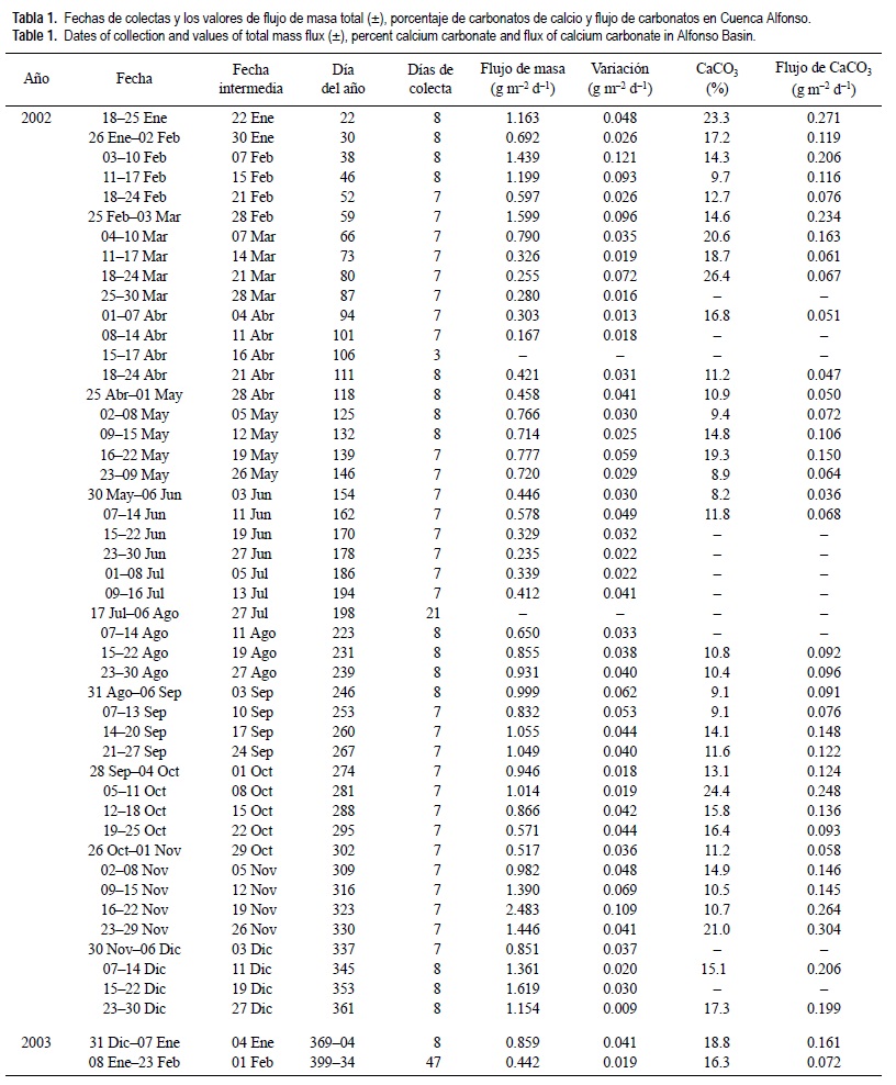 En un estudio de seis años que Thunell (1998) realizó con trampas de sedimentos en la Cuenca de Guaymas, que tiene 2000 m de profundidad y está situada al norte del Golfo de California central, también se observó abundante material biogénico en las partículas sedimentarias, pero el sílice biogénico (asociado a la mezcla por mareas y de surgencias que impulsaron la producción del fitoplancton) fue el componente dominante en lugar del carbonato de calcio. El promedio de los flujos de CaCO3 en la Cuenca Alfonso (0.128 g m-2 d-1) es mucho más grande que el 0.05 g m-2 d-1 determinado en la Cuenca de Guaymas (Ziveri y Thunell 2000). Además, el flujo medio de masa total en la Cuenca de Guaymas fue de 139 g m-2 año-1, que es considerablemente menor a los 300 g m-2 año-1 que registramos en Cuenca Alfonso.