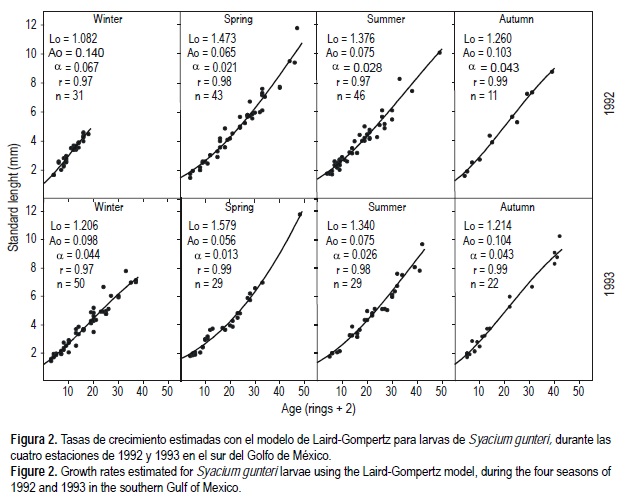 La TE de S. gunteri para cada estación del año fluctuó entre 1.08 y 1.58 mm y estuvo por debajo de los 1.76 mm registrados por Flores-Coto et al. (1992) quienes, a diferencia de este trabajo, usaron un modelo exponencial. Aplicando ese modelo a nuestros datos la TE fluctúa entre 1.82 y 2.0 mm. Estos aspectos justifican la elección del modelo de Laird-Gompertz, ya que éste ofrece la mejor aproximación para la TE. Aunque no hay datos de validación, los valores obtenidos parecen bastante aceptables considerando que las larvas capturadas más pequeñas midieron entre 1.26 y 1.60 mm y ya tenían anillos de crecimiento en los otolitos.