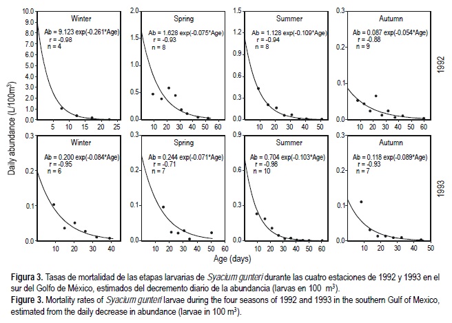 Las tasas de mortalidad fluctuaron entre 0.054 y 0.109. La excepción fue en invierno de 1992 con 0.261, el valor más alto registrado, aunque debe ser considerado con cautela, ya que es resultado de poca información para el modelo y de un grupo de larvas muy pequeñas y límites muy estrechos de edad y tallas entre 2.0 y 5.9 mm. La tasa de mortalidad obtenida para S. gunteri en este estudio es muy similar a las estimadas previamente para esta especie por Sánchez-Iturbe (1993) quien encontró valores entre 0.07 y 0.09.