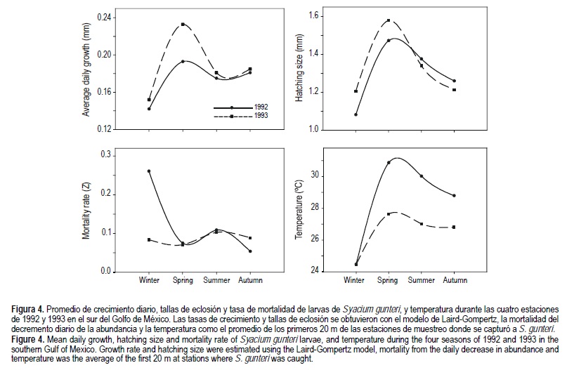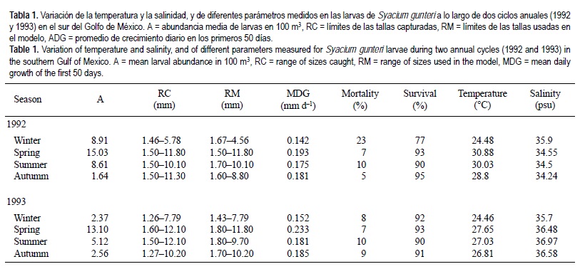 El crecimiento y la mortalidad dependen de factores que fluctúan estacionalmente. Entre éstos, los más importantes son la temperatura, la salinidad, la disponibilidad de alimento y los predadores. Diferencias estacionales en el crecimiento y la mortalidad han sido puestas de manifiesto por diversos autores (Nixon y Jones 1997, Xiao 1999, Wang y Tzeng 1999, Neuman et al. 2001). Sin embargo, en el sur del Golfo de México no se han realizado trabajos de esta naturaleza con ninguna especie. El objetivo de esta investigación fue analizar la variabilidad en el crecimiento y mortalidad de la fase larvaria de S. gunteri durante las diferentes estaciones de dos ciclos anuales (1992 y 1993).