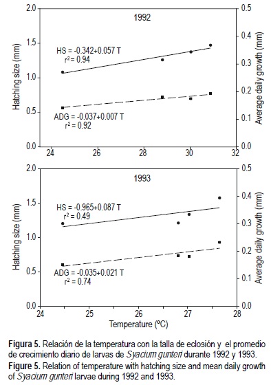 Aunque la relación entre altas temperaturas y alta tasas de crecimiento es un hecho generalmente aceptado (Houde 1989, Pepin 1991), hay observaciones contrarias como las realizadas Fey (2001). La dependencia entre crecimiento y temperatura registrada para S. gunteri en este estudio sólo es cierta cuando se analizan los datos ciclo por ciclo, pero no en conjunto. Por consiguiente, esta relación no es tan general y debe estudiarse caso por caso, dado que la temperatura puede ser responsable del aumento del crecimiento, pero sólo dentro de ciertos límites óptimos para cada especie (Hoff y Fuiman 1993, Larson y Berlung 1998, Edsall 1999, Steinarsson y Bjórnsson 1999, Rodríguez-Muñoz et al. 2001), y con un elemento de variación cíclica de algún modo independiente de los valores de temperatura per se.