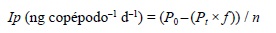 donde Ip = pigmento ingerido, P0 = concentración del pigmento al tiempo 0 (ng), Pt= concentración del pigmento al final de la incubación (ng), f = cambio relativo del pigmento en los frascos control (Pt /P0), y n = número de copépodos.