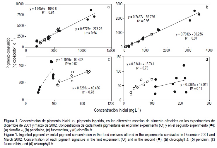 Aunque la densidad de G. catenatum en el segundo experimento fue 2.3 veces superior a la del primer experimento, en ambos casos se observó una relación lineal entre el consumo y la concentración de alimento ofrecido (fig. 1a), los copépodos consumieron en proporción con la peridinina disponible en ambos casos (fig. 1b). Lo anterior también se observó con la fucoxantina (fig. 1c). En cambio, el consumo de clorofila b fue más variable (fig. 1d). En ambos experimentos la concentración de la zeaxantina se incremento (datos no mostrados), sugiriendo que este grupo no fue consumido por A. clausi.