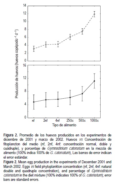 La producción de huevos fue menor en los experimentos control (en los que se suministró fitoplancton natural) para ambos experimentos. Aunque la tendencia fue similar (fig. 2), en el primer experimento se observaron menor variabilidad y diferencias significativas entre los controles y las mezclas con G. catenatum (prueba a posteriori de Tukey-Kramer, P < 0.05), en tanto que en el segundo experimento no se observaron diferencias significativas entre las concentraciones menores de G. catenatum y los controles alimentados con fitoplancton natural (prueba a posteriori de Tukey-Kramer, P < 0.05). No obstante, en ambos experimentos el promedio de huevos producidos aumentó conforme se incremento la proporción de G. catenatum, siendo máximo cuando este dinoflagelado fue la única presa disponible. Esto podría ser indicativo de una mejor calidad nutricional del dinoflagelado con respecto al fitoplancton natural. Esta idea se refuerza cuando se compara el promedio de huevos producido en los experimentos con una concentración mayor de fitoplancton natural y se observa que no hay diferencias significativas (4.5 ± 1.3 huevos copépodo-1 y 4.7 ± 1.2 huevos copépodo-1, respectivamente).