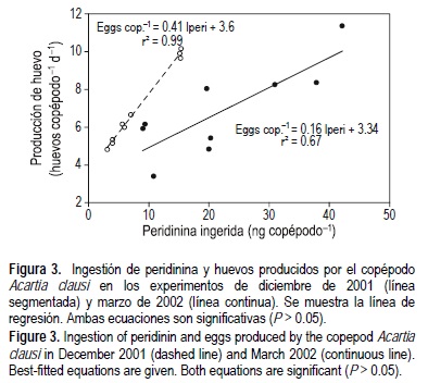 La producción de huevos con cada una de las mezclas de alimento fue muy similar en los dos experimentos; sin embargo, la variabilidad observada en el segundo experimento, con mayor concentración de dinoflagelados, fue más alta. De hecho, cuando comparamos la concentración de peridinina ingerida durante cada experimento, observamos que la cantidad ingerida es superior en el segundo experimento, pero no se obtiene un correspondiente incremento en la producción de huevos (fig. 3). En otras palabras, A. clausi ingiere más dinoflagelados, pero no produce más huevos.