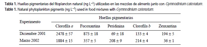 En el primer experimento se utilizó una densidad de G. catenatum de 66,000 cél L-1, mientras que en el segundo experimento la densidad fue de 151,800 cél L-1. Se utilizaron mezclas de alimento con diferentes proporciones de fitoplancton natural y cultivo de G. catenatum en proporciones de 100:0%, 75:25%, 50:50%, y 0:100% (tres réplicas por tratamiento más dos controles sin copépodos). Se filtró una muestra inicial de cada uno de los frascos experimentales y testigos para el análisis de huellas pigmentarias. Todos los frascos experimentales y testigos fueron incubados por 24 h a la misma temperatura en que fueron recolectados los organismos del medio (21 ± 1°C para diciembre y 22 ± 1°C en marzo). La cantidad de alimento ingerido durante el periodo de incubación se calculó a partir de los cambios observados en las principales huellas pigmentarias, utilizando la siguiente expresión (Frost 1972):