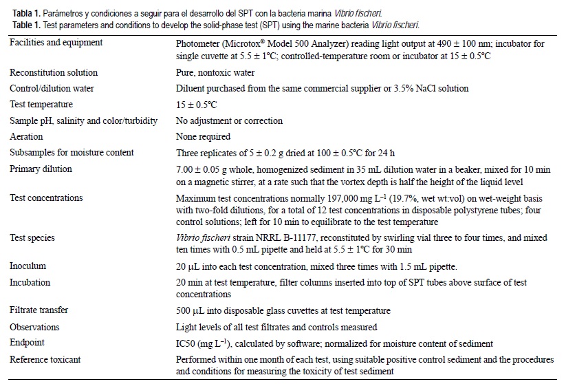 El ensayo sobre la fase sólida, denominado Microtox® Solid Phase Test (SPT) fue desarrollado por AZUR Environmental (Carlsbad, CA, USA) y se ha usado durante los últimos años en distintos estudios para evaluar toxicidad aguda (Stronkhorst 2003, Riba et al. 2004). El protocolo SPT mide la emisión de luz de las bacterias después de su incubación en contacto directo con una mezcla de sedimento y disolvente, y tras haber sido recuperadas mediante la filtración de la mezcla en estudio. El principal factor de confusión identificado para la interpretación de los resultados está relacionado con la granulometría del sedimento, ya que se ha encontrado un efecto directo del contenido en finos de la muestra sobre la toxicidad registrada (Benton et al. 1995, Ringwood et al. 1997). El más reciente de los protocolos desarrollados por el proveedor del aparato (AZUR 1998a) para muestras sólidas y de sedimento es el Basic Solid Phase Test (BSPT). Este protocolo, más simple y rápido que el SPT, suprime la filtración y mide la emisión de luz cuando la bacteria está aún en contacto con el sedimento, por lo que la emisión de luz no se ve afectada por las bajas tasas de recuperación de las bacterias durante ese paso adicional. El BSPT se ha usado recientemente en distintos estudios (Mowart and Bundy 2001, Abbondanzi et al. 2004, Campisi et al. 2005) y su uso para la evaluación inicial de toxicidad parece igualmente recomendable.