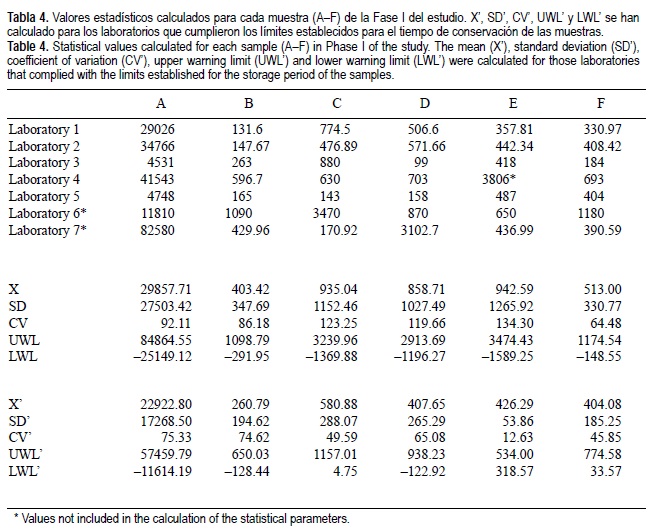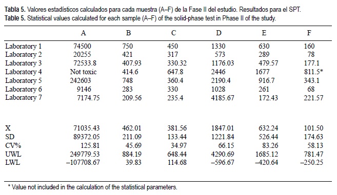 En las tablas 4, 5 y 6 se presentan los resultados de cada laboratorio y el promedio, la desviación estándar, el coeficiente de variación, y los valores máximos y mínimos de aceptación de los resultados calculados para cada muestra. Para la Fase I estos valores se calcularon para dos series de datos: una incluyendo los resultados de todos los laboratorios y otra sin incluir aquellos laboratorios que hicieron el ensayo fuera de los límites de tiempo (es decir, excluyendo los resultados de los laboratorios 6 y 7) y excluyendo los datos fuera de los rangos de aceptabilidad (UWL y LWL). Debido al bajo número de casos (laboratorios) los rangos de aceptabilidad de los resultados eran muy amplios, pero en total tres datos se encontraron fuera de ellos: dos datos correspondientes a ensayos realizados después del periodo de conservación de los sedimentos (cuatro semanas) y un dato proporcionado por el laboratorio 4. Estos datos, que en todos los casos correspondieron a una toxicidad menor a la estimada por el resto de los laboratorios, fueron eliminados de los cálculos posteriores. Cuando se incluyen todos los laboratorios, los CV iban de 64% a 134% con un promedio de 103%. Cuando se excluyen los laboratorios que hicieron sus ensayos a destiempo estos valores se encuentran entre 45% y 75% con un promedio de 53%.