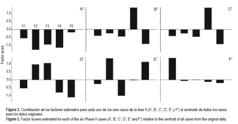El conjunto de datos originales comprendía 13 variables relacionadas con las propiedades del sedimento (As, Cd, Cr, Cu, Hg, Ni, Pb, Zn, Σ7-PCBs y Σ16-PAHs y el porcentaje de arenas, porcentaje de finos y contenido en material orgánica del sedimento) y 14 variables de efectos biológicos (tabla 3): siete laboratorios para el ensayo Microtox® siguiendo el protocolo SPT (A1 a A7), tres siguiendo el protocolo BSPT (B1 a B3) y cuatro para el ensayo de desarrollo larvario con embriones de erizo de mar (C1 a C4). Los resultados clasifican las variables originales en cinco nuevos factores que explican el 100% de la varianza total. La tabla 4 incluye los porcentajes de varianza explicada por cada uno de los nuevos factores y los pesos de cada variable original. En la figura 2 los coeficientes de los nuevos factores para cada uno de los casos (muestras) se representan frente al centroide de todos los casos de los datos originales para estimar la contribución de cada uno de los casos en las nuevas variables o factores. El primer factor, que explica más del 45% de la varianza total, representa las variables contenido en materia orgánica, Cd, Cr y Pb, con los pesos más elevados para las concentraciones de PCBs y PAHs. Este factor también explica la mayor parte de la variabilidad asociada al Microtox® con ambos protocolos (SPT y BSPT), y a los efectos del ensayo con embriones de erizo de mar de dos laboratorios. El factor 2 representa el porcentaje de finos y el contenido en materia orgánica del sedimento, aunque para esta última variable con pesos inferiores a los encontrados para el factor 1 y las especies metálicos As, Cr y Hg. Este factor explica la mayor parte de la variabilidad asociada con el ensayo con embriones de erizo de mar, que también parece influido por el Ni, representado por el factor 5 y con altos pesos positivos. El factor 3, que explica algo más del 15% de la varianza total, explica parte de la varianza asociada al As, Cu, Pb y Zn y a uno de los laboratorios para el Microtox®. Los otros dos factores (4 y 5) explican cada uno algo menos del 10% de la varianza total pero con correlaciones interesantes para algunas de las variables. El factor 4 agrupa el contenido en material orgánica de los sedimentos con los compuestos Hg y PCBs, así como los efectos tóxicos registrados en la mitad de los laboratorios que realizaron el Microtox®. Por otro lado, el factor 5 agrupa las concentraciones de Ni, los efectos tóxicos registrados con el ensayo con embriones de erizo de mar y, en menor medida, ciertos efectos en la disminución de la luminiscencia.