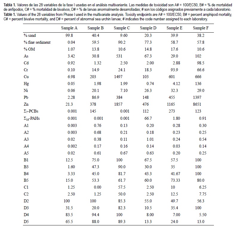 El conjunto de variables originales comprendió 28 series de datos, cada una con 10 variables químicas (As, Cd, Cr, Cu, Hg, Ni, Pb, Zn, Σ7-PCBs y Σ16-PAHs), 3 parámetros convencionales del sedimento (porcentaje de arenas, porcentaje de finos y contenido en material orgánica) y 15 variables de efecto biológico: los resultados para el ensayo Microtox® SPT expresados como unidades tóxicas (100/EC50), el porcentaje de larvas anormales tras 48 h de exposición a los lixiviados, el porcentaje de mortalidad de anfípodos, así como el porcentaje de mortalidad de bivalvos tras 14 días de exposición (tabla 1). Sólo se incluyeron en el análisis multivariante los resultados de los laboratorios que obtuvieron resultados con todas las muestras y que, además, se consideraron aceptables: cinco laboratorios para el Microtox®, nombrados A1, A2, A3, A4 y A5 (Casado-Martínez et al. 2006b); cuatro para el ensayo con anfípodos, identificados como B1, B3, B4 y B5 (Casado-Martínez et al. 2006c); dos para el ensayo con bivalvos, C1 y C2 (Casado-Martínez et al. 2006d); y cuatro para el ensayo con larvas de erizo de mar, D2, D3, D4 y D5 (Casado-Martínez et al. 2006e).