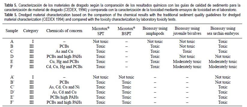 Las condiciones relacionadas con el muestreo y manipulación de los sedimentos han sido previamente discutidas (Casado-Martínez et al. 2006a), así como los resultados para cada uno de los bioensayos utilizados (Casado-Martínez et al. 2006b-e). El objetivo de este trabajo es analizar globalmente los resultados y conclusiones, y estudiar el uso de los ensayos biológicos en los procesos de caracterización para la gestión de dragados en España conjuntamente con la tradicional caracterización química. Además, las series de datos se estudiaron mediante un análisis estadístico multivariante para evaluar la relación entre los efectos biológicos adversos y la concentración de los compuestos potencialmente tóxicos.
