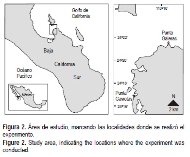 El estudio fue realizado en dos localidades de fácil acceso en la Bahía de La Paz, Baja California Sur, México (fig. 2), Punta Gaviotas (24°17.134' N, 110°19.870' W) y Punta Galeras (24°21.236' N, 110°17.028' W), debido a que la forma columnar de P. panamensis es relativamente más abundante en Punta Gaviotas, y la forma masiva en Punta Galeras. Se trabajó a profundidades de 1 a 3 m. Para observar si la capacidad de regeneración de ambas formas se mantenía a lo largo del año, el experimento se realizó separadamente durante la temporada fría (19°-24°C, de marzo a abril de 2004) y la temporada cálida (28°-30°C, de septiembre a octubre de 2004). Las temperaturas fueron tomadas in situ. Se escogieron en la temporada cálida 26 y 28 colonias de las formas masiva y columnar, respectivamente, y 30 colonias de ambas formas en la temporada fría. Con el fin de que el proceso de regeneración no fuera afectado por el tamaño de la colonia (Oren et al. 2001), se escogieron sólo colonias con tamaño mayor a 40 cm2.