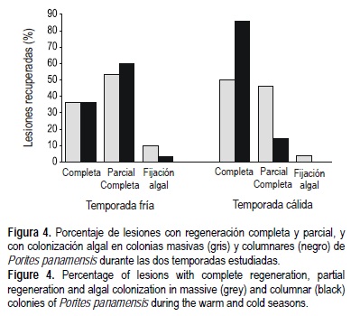 La figura 4 muestra que los porcentajes de regeneración completa y parcial en la temporada fría fueron similares entre las formas. En contraste, la temporada cálida mostró diferencias en los porcentaje de regeneración completa entre las formas, en los que la columnar mostró un mayor porcentaje que la masiva. También se pudo observar que la proporción de las colonias que presentaron fijación algal en las lesiones fue diferente entre las formas, mostrando la masiva fijación tres veces mayor que la columnar en las dos temporadas estudiadas (fig. 4).