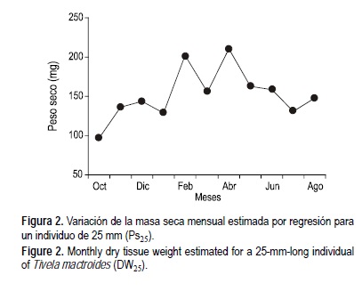 Para el análisis de las relaciones alométricas mensuales se tomaron individuos abarcando todos los grupos de tallas, a los cuales se midió la longitud anteroposterior (Lt) de la concha con un vernier digital (0.01 mm). Para la cuantificación del peso total (Pt) se eliminó el detritus de la concha, para la obtención del peso del tejido blando fresco (Pf) se escurrió la humedad y para obtener el peso del tejido seco (Ps) (±0.0001 g), se deshidrató en una estufa (60°C/72 h). La relación entre la longitud y el peso se analizó con la ecuación de alometría (Ps = aLtb) con transformación logarítmica y ajustada por el método de los mínimos cuadrados (Wilburg y Owen 1964). Se utilizaron los parámetros de las ecuaciones de regresión mensuales para obtener el peso seco de un organismo de 25 mm de longitud (Ps25). La estructura de la población se analizó elaborando histogramas mensuales de longitud agrupados en clases de 2 mm (Harding 1949). Con los datos biométricos se determinó el índice de condición (IC = 100 x Ps/Pf) y el rendimiento en carne (R = 100 x Pf/Pt) mensual y por intervalos de longitud total (5 mm) (Hickman e Illingworth 1980).
