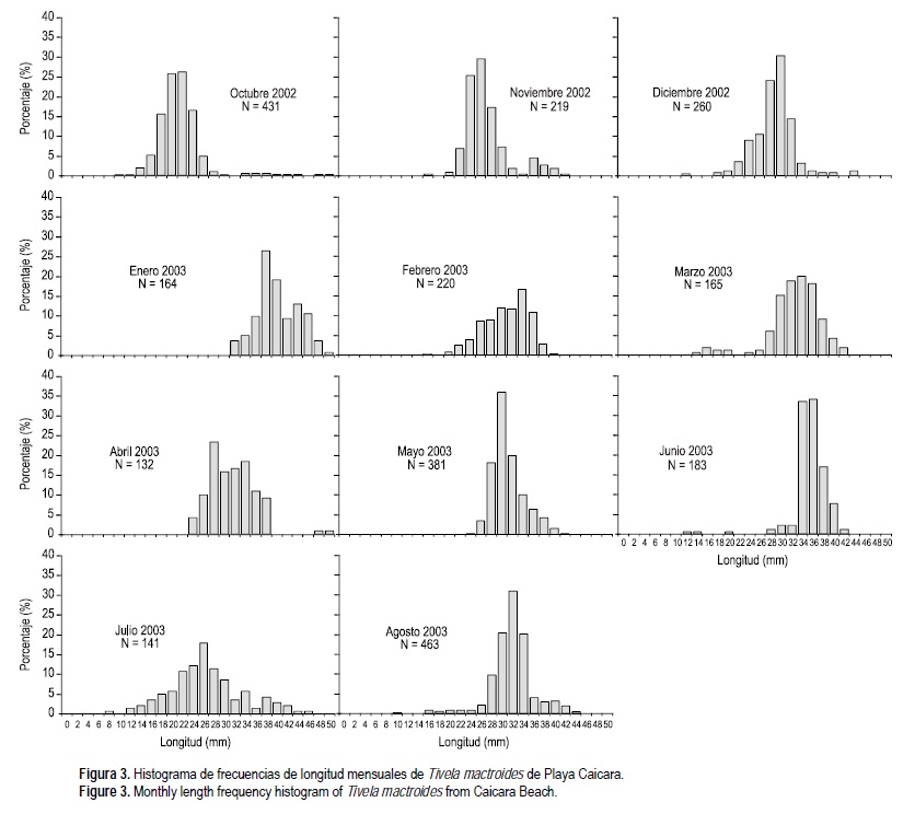 La distribución de frecuencias de tallas observada en la localidad fue muy semejante a las informadas para Playa Güíria (Tatá y Prieto 1991), Ensenada la Guardia (Mendoza y Marcano 2000) y Carenero (Egañez 2004), con una baja proporción de individuos menores de 8 mm de longitud y la existencia de dos cohortes, una dominante de rápido crecimiento detectada en octubre de 2002 con un promedio entre 22 y 24 mm de longitud, y otra cohorte en proceso de reclutamiento observada en marzo de 2003. Es notoria, sin embargo, la existencia de bivalvos con longitudes de hasta 50 mm no reportados en otras poblaciones de Venezuela.