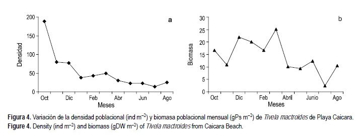 Los promedios mensuales de biomasa en peso seco de los tejidos blandos por unidad de área fueron bajos como consecuencia de las bajas densidades señaladas anteriormente; sin embargo, los máximos valores de densidad observados entre febrero y abril de 2003 coinciden con el primer máximo reportado para la población de Carenero (Egañez 2004) y difieren notablemente de las densidades observadas en las poblaciones de Playa Güíria y Ensenada La Guardia, cuyos valores máximos de biomasa se observaron en julio y agosto (Tatá y Prieto 1991, Mendoza y Marcano 2000). Las variaciones de la biomasa y densidad en el periodo estudiado pueden explicarse por una extrema heterogeneidad espacial de la población, la incorporación de reclutas provenientes de desoves previos y la explotación artesanal constante de la especie en el área. MacLachlan et al. (1996) han señalado que en playas impactadas por pesquerías y otras actividades humanas, la repoblación ocurre ya sea por el movimiento de juveniles o por el reclutamiento de larvas planctónicas. Además, la capacidad reproductiva y maduración sexual es comúnmente observada en diferentes poblaciones de modo contínuo en diferentes épocas del año (Marques 2004). Egañez (2004) señaló cambios marcados de densidad de 50 a 7000 ind m-2 en sólo cuatro meses en Carenero. La biomasa media mensual es, sin embargo, comparable a la reportada por Godoy (1997) en el Zulia y Donax denticulatus en Punta Araya, Sucre (Vélez et al. 1985).