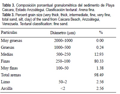 El análisis granulométrico del sedimento indica que éste está compuesto principalmente por arenas finas (80.33%), seguido por arenas medias (12.93%), y con mucho menor importancia arenas muy finas (1.36%) y arena gruesa (0.24%), abarcando el 98.49% del total del sedimento. La fracción de limo y arcilla representó el 2.56%. El pH fue ligeramente alcalino (7.4), la conductividad eléctrica salina (CE) de 7.1 dS y la textura fue de arena fina (tabla 3).